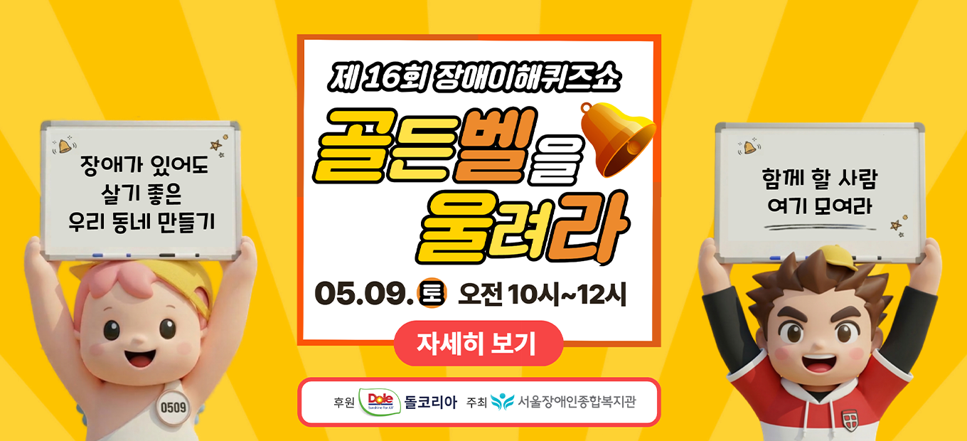 「제 16회 장애이해퀴즈쇼 ‘ 골든벨을 울려라’ 」장애가 있어도 살기 좋은 우리 동네 만들기, 함께할 사람 여기여기 모여라!■일시2026. 5. 9.(토) 10:00 ~…