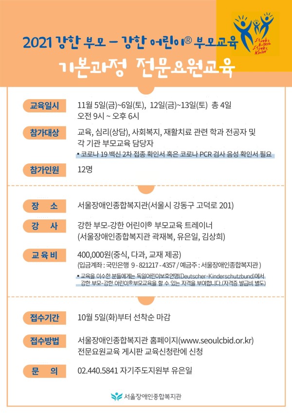 교육, 심리(상담), 사회복지, 재활치료 관련 학과 전공자 및 각 기관 부모 교육 담당자 <코로나 19 백신 2차접종 확인서 혹은 코로나PCR검사 음성 확인서 필요>