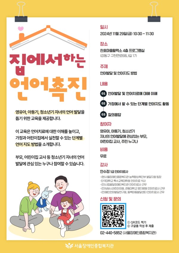 마감 '영유아, 아동기, 청소년기 자녀의 언어 발달을 돕기 위한 교육' 집에서 하는 언어촉진 참여자 모집