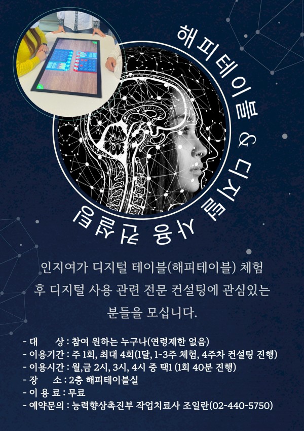 디지털 인지여가 플랫폼 '해피테이블'을 활용한 체험 후 디지털 사용 전문 컨설팅에 참가하고자 하는 분들을 모집합니다.