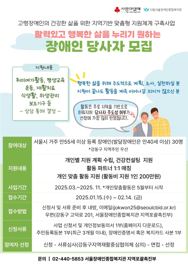 참여대상 : 서울시 거주 만55세 이상 등록장애인(발달장애인의 경우 만40세 이상) 30명 (*강동구 지역주민 우선)