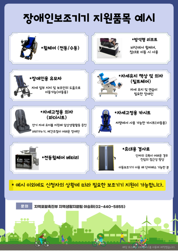 - 편의증진 보조기기 지원(휠체어, 휠체어 리프트, 이동식 경사로, 전동휠체어 배터리 등)