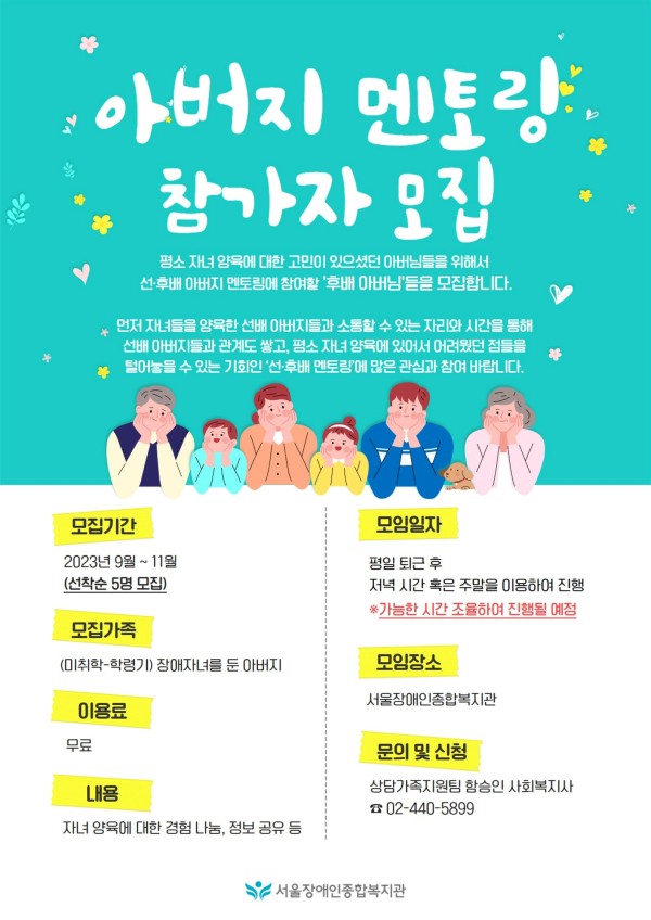평소 자녀 양육에 대한 고민이 있으셨던 아버님들을 위해서 선·후배 아버지 멘토링에 참여할 후배 아버님들을 모집합니다.