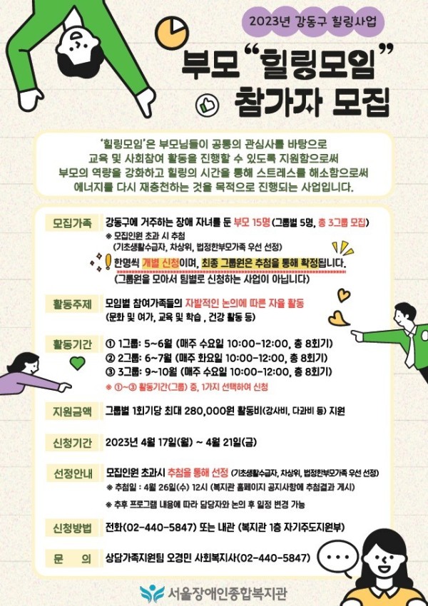 마감 2023년 강동구 힐링사업 부모자조모임 "힐링모임" 참가자 모집(4/17~4/21)