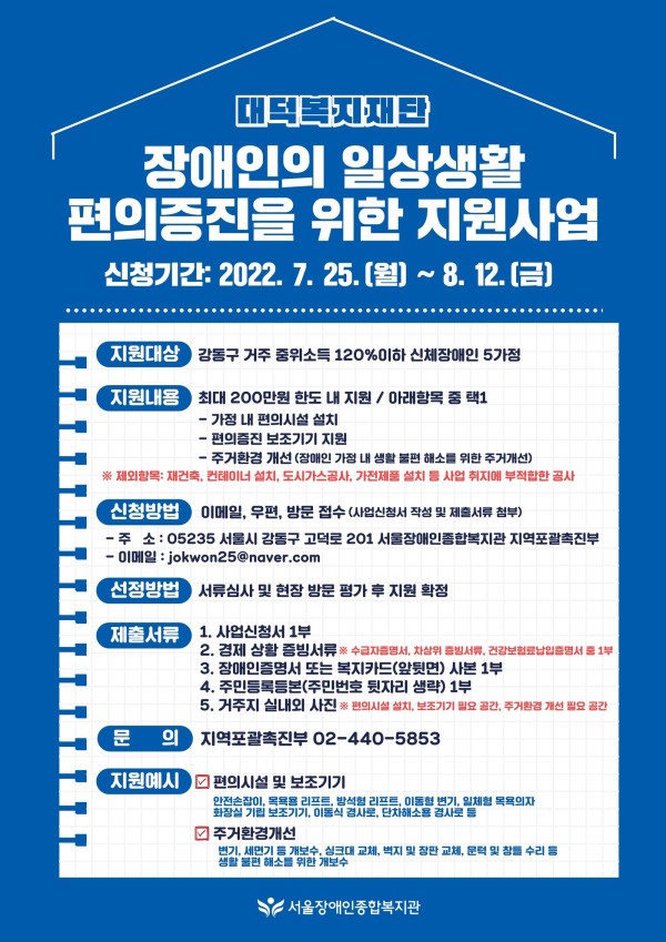 <대덕복지재단 후원 장애인 일상생활 편의증진 지원사업 신청 안내>
