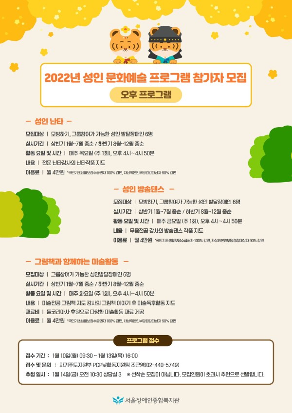 - 다음글 [모집] 2022년도 성인 문화예술 오전 프로그램 참가자 모집 22.01.06