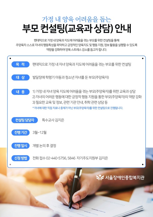 자기주도지원부에서 팬데믹으로 가정 내 양육 및 지도에 어려움을 격고 있는 부모(주양육자)를 위한 컨설팅을 진행합니다.