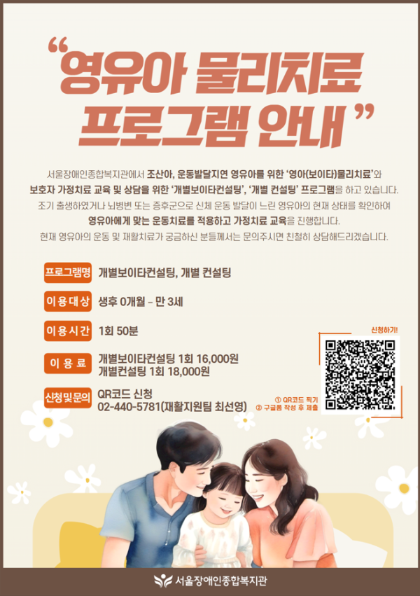 서울장애인종합복지관에서는 조산아, 운동발달지연 영유아를 위한 '영아(보이타) 물리치료'를 하고 있습니다.