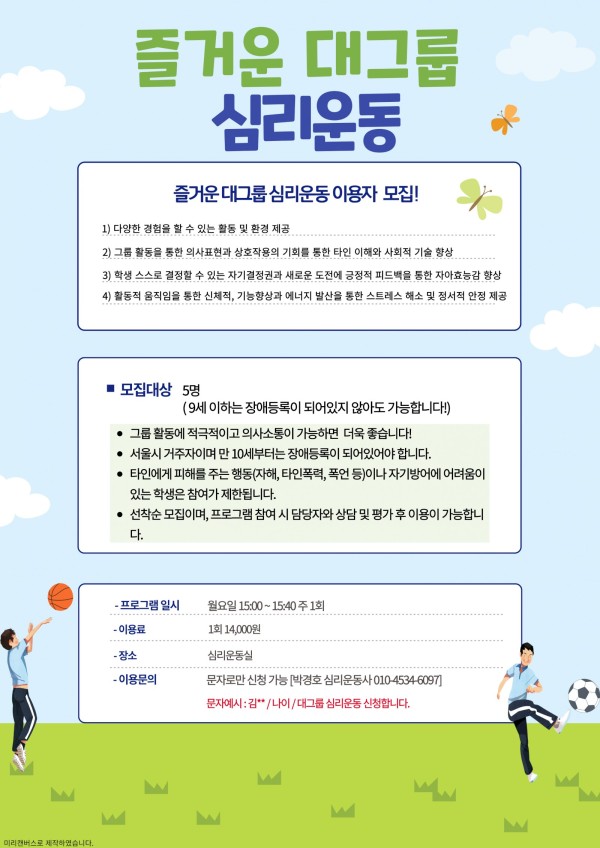 • 신청 방법 : 문자로만 신청 가능 [박경호 심리운동사 010-4534-6097]