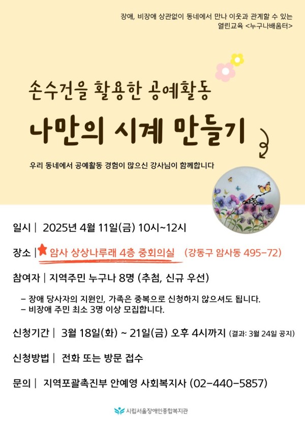 ● 신청기간: 3월 18일(화)~21일(금) 오후 4시까지 (*결과는 3월 24일(월) 복지관 홈페이지 공지)