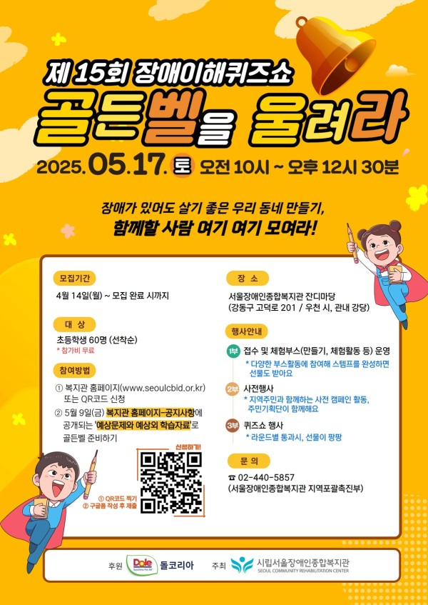 서울장애인종합복지관에서는 ‘장애를 바르게 이해하고 더불어 사는 환경’을 위해 골든벨 사업을 하고 있습니다. 관심 있는 주민의 자녀와 이웃이 있다면 신청 및 소개 부탁드립니다.