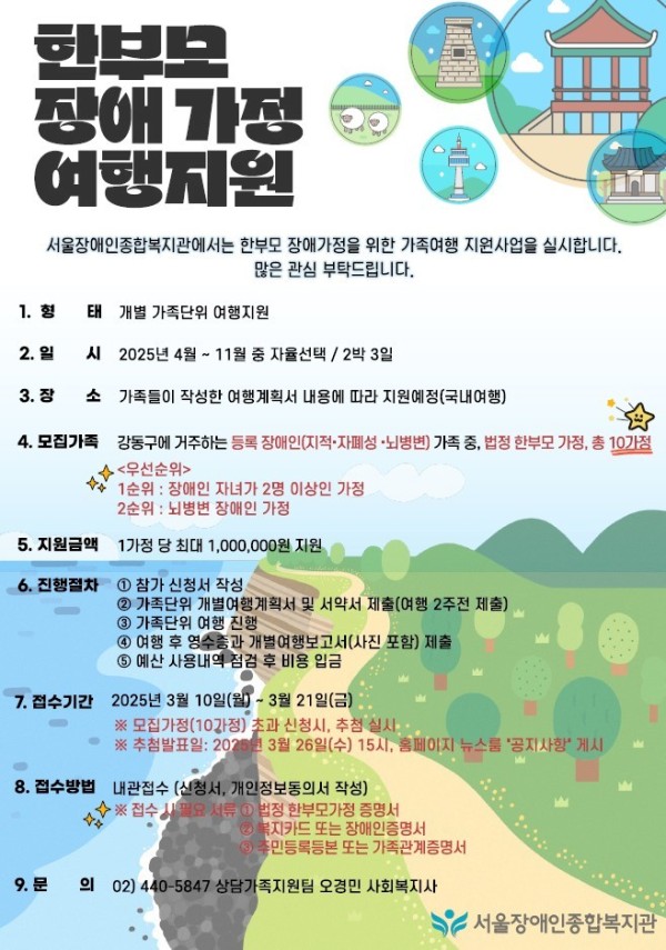 서울장애인종합복지관에서는 한부모 장애 가정을 위한 가족여행지원사업을 실시합니다. 많은 관심 부탁드립니다.