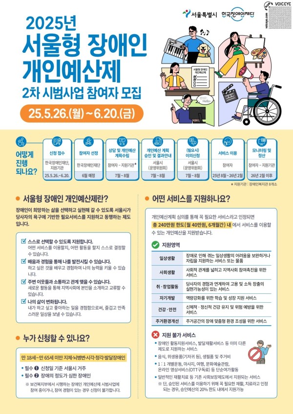 서울시에서 추진하는 "2025 서울시 장애인개인예산제 2차 시범사업 운영"을 위한 사업 참여자를 아래와 같이 모집하오니, 많은 관심과 참여 바랍니다.