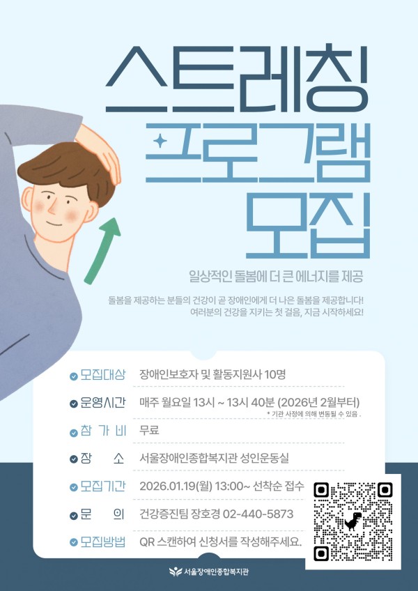 중증 및 중고령 장애인을 돌보는 보호자와 활동지원사의 건강을 위해! 서울장애인종합복지관 스트레칭 프로그램에 참여해보세요!