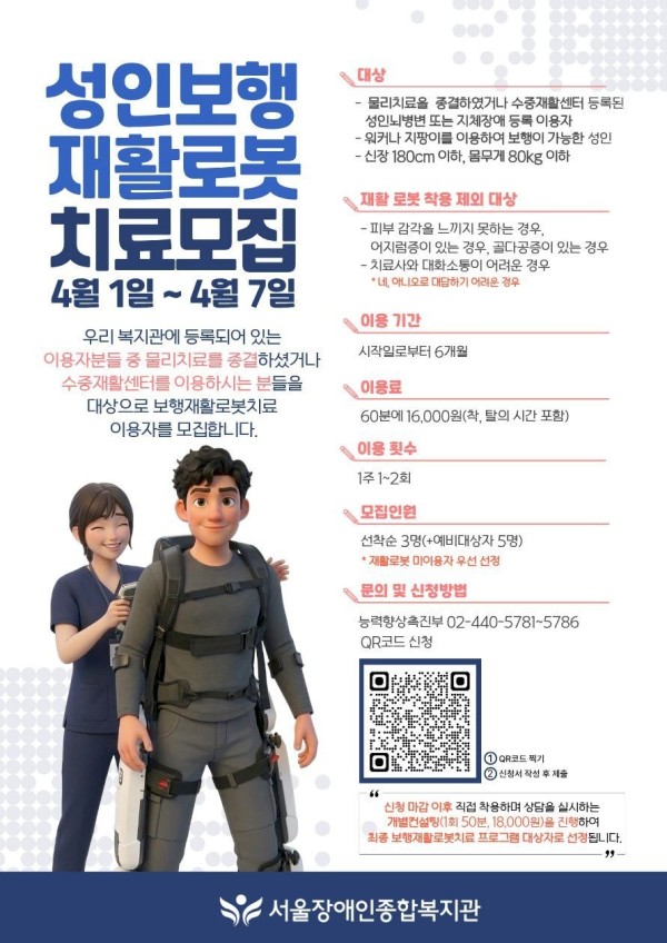 저희 복지관에 등록되어 있는 이용자분들 중 물리치료를 종결하셨거나 수중재활센터를 이용하시는 분들을 대상으로 보행재활로봇치료 이용자를 모집합니다.