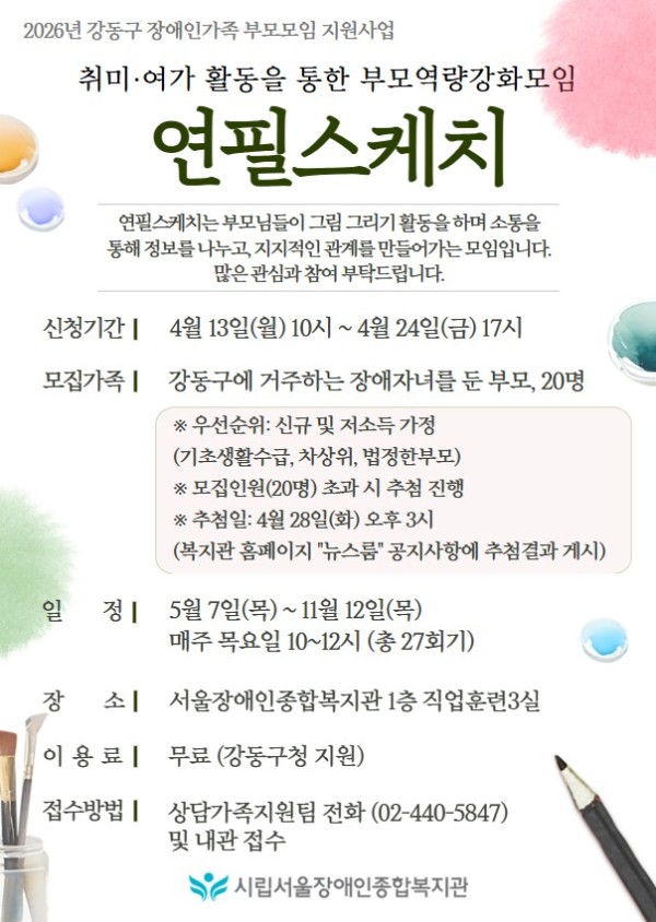 마감 2026년 강동구 장애인가족 부모모임 지원사업 취미여가를 통한 부모역량강화모임 "연필스케치" 참가자 모집(4…