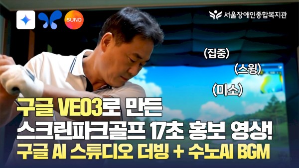 AI와 함께 만든 스크린파크골프 소개 영상 AI 시대, 서울장애인종합복지관은 복지 현장에 인공지능 기술을 어떻게 접목할 수 있을지 고민하며 실험하고 있습니다. 이번 영상은 복지관의 새로운 건강 프로그램인 ‘스크린파크골프’를 널리 알리기 위해 AI 영상 제작 도구를 적극 활용해 완성했습니다. AI와 복지관 홍보의 만남은 앞으로도 계속됩니다. 활용 기술 영상 제작: Google VEO3 내레이션: Google AI Studio 배경 음악: Suno AI 프로그램 운영: 건강증진팀 기획·편집: 박재훈 사회복지사 (서울장애인종합복지관 디지털융합팀)
