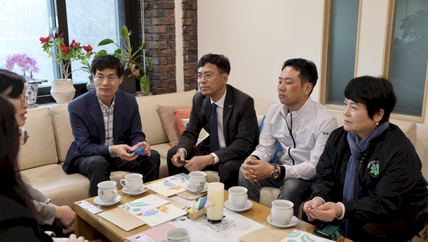 최미영 관장의 이야기를 듣는 서울강동라이온스클럽 임영철 회장과 박종문 차기회장, 회원들(왼쪽부터)