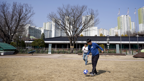 햇살 좋은 봄날, 복지관 앞 잔디밭에서 기정 씨는 파란 축구공을 따라 달려갑니다.