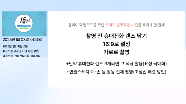 이번 수요조회는 직원 간 정보 공유의 중요성을 실감하게 하는 시간이었습니다. 박재훈 디지털융합팀 팀장은 실질적인 업무에서 바로 활용할 수 있는 ‘지극히 업무적인 사진 찍는 방법’을 소개했습니다.