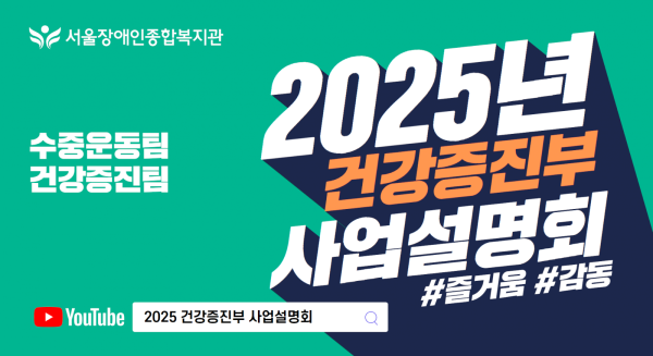 (영상 링크)2025년 건강증진부는 이렇게 일합니다 (수중운동팀, 건강증진팀) 페이지 정보 작성자 서울장애인종합복지관 작성일25-01-13 17:19 조회수517 본문 자세히 보기2025년 서울장애인종합복지관 건강증진부는 이런 일을 합니다.지금 서울장애인종합복지관 유튜브 채널에서 보실 수 있습니다.영상 제작 : 서울장애인종합복지관 디지털융합팀 [클릭! 수중운동팀 사업설명회 영상 보기][클릭! 건강증진팀 사업설명회 영상 보기] 목록 답변 이전글 (영상 링크)2025년 미래혁신부는 이렇게 일합니다 (기획협력팀, 디지털융합팀) 25.01.13 다음글 (영상 링크)2025년 지역포괄촉진부는 이렇게 일합니다 (지역옹호협력팀, 지역생활지원팀) 25.01.13