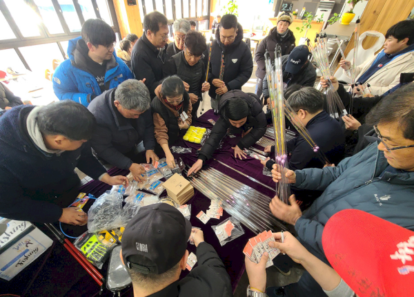 회원들과 낚시회사의 십시일반 후원으로 모인 바자회 상품들과 경매 상품들, 바자회는 10분만에 뜨겁게 종료