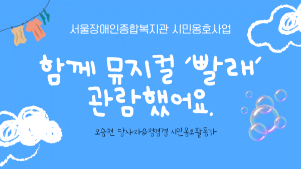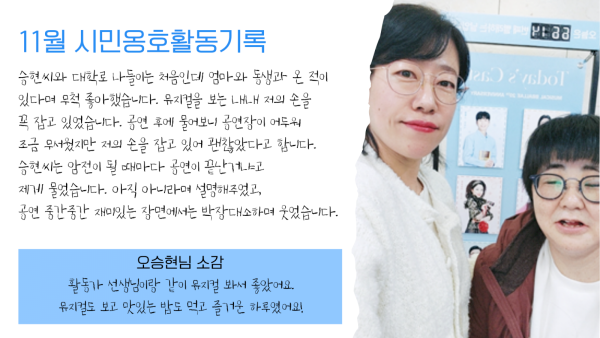 "활동가 선생님이랑 같이 뮤지컬 봐서 좋았어요, 뮤지컬도 보고 맛있는 밥도 먹고 즐거운 하루였어요!"