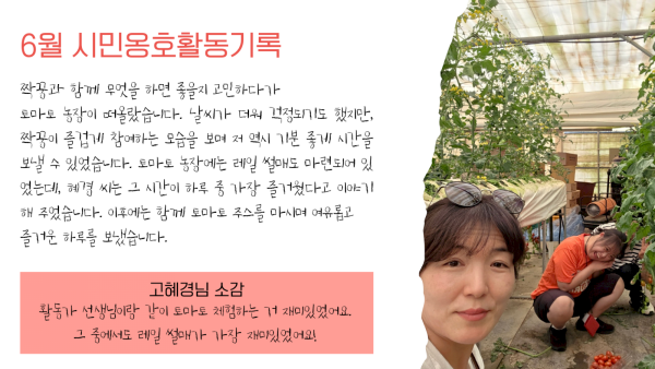 "활동가 선생님이랑 같이 토마토 체험하는 거 재미있었어요, 그 중에서도 레일 썰매가 가장 재미있었어요!"