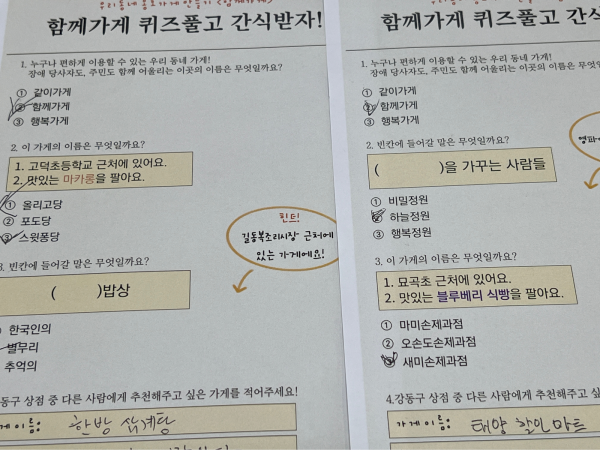 함께가게와 관련된 간단한 퀴즈를 진행하고 정답을 맞힌 분들께는 랜덤으로 함께가게의 간식을 나누었습니다.