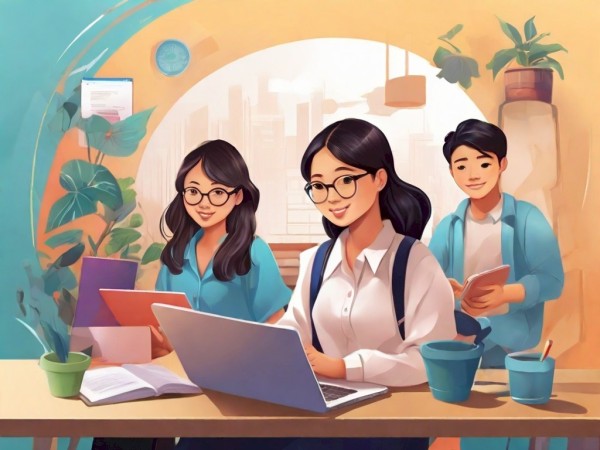 4. 디지털 직무와 유연한 근무를 통한 동양인 대학생 고용의 새로운 트렌드에 관한 그림을 수채화 형식으로 그려줘. (레오나르도ai)