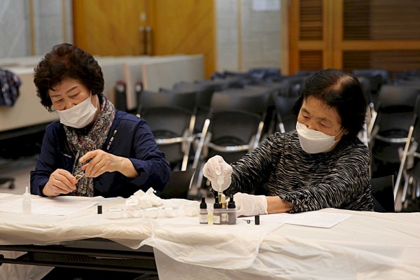 자원봉사자들은 샴푸바를 만들며 "강당에 향기가 가득 차서 이미 힐링 되는 기분이에요.",