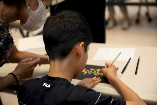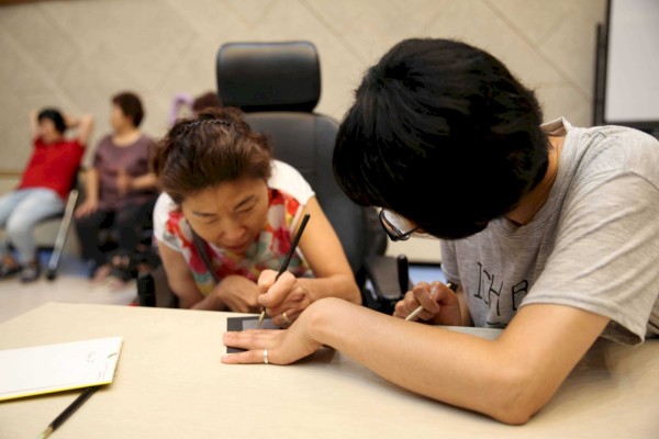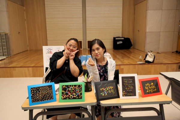 또 스크레치 보드를 활용한 켈리그라피 액자 만들기 활동을 할 때는 복지관 소모임인 여성장애인 느슨한 모임을 하고 계신 여성 당사자분들이 지원인으로 함께 해주셨습니다. 손에 힘을 주기 힘드시거나 정교한 작업이 어려우신 분들 곁에서 1대 1로 지원하며 원하는 글귀가 담긴 켈리그라피 액자를 만드실 수 있도록 거들었습니다. 활동 안에서도 서로가 서로를 자연스럽게 도왔습니다.