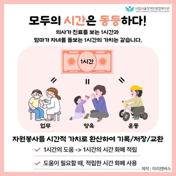 의사가 진료를 보는 1시간과 엄마가 자녀를 돌보는 1시간의 가치는 동등하다는 가치에 따라 도움을 시간 단위로 주고 받습니다.