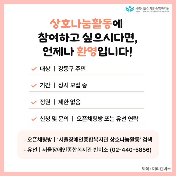 상호나눔활동이 궁금하신 분들은 카카오톡 오픈 채팅방에 ‘서울장애인종합복지관 상호나눔활동’을 검색 후,