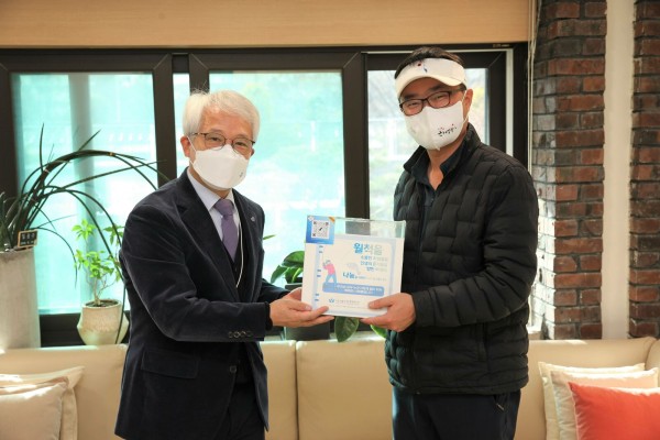 후원금 모금함 전달(왼쪽 곽재복 관장, 오른쪽 일학 손태성 과장)