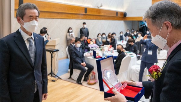 자세히 보기 자세히 보기 ▲ 왼쪽: 공로포상 시상을 하고 있는 백경학 상임이사 모습 / 오른쪽 : 기관장 인사를 하고 있는 곽재복 관장 모습