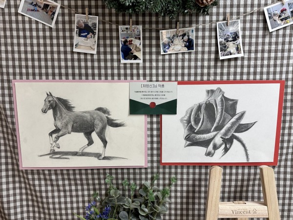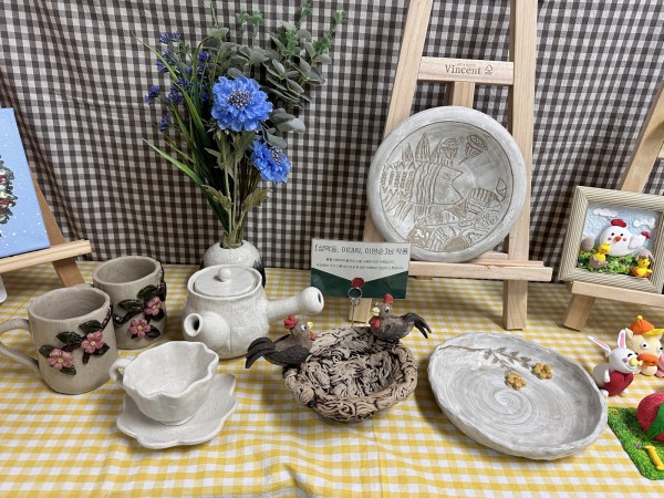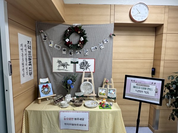 자세히 보기자세히 보기자세히 보기자세히 보기전시 공간에는 직접 빚은 도자기와 공예 작품, 말과 장미를 세밀하게 표현한 그림, 그리고 겨울의 분위기를 담아낸 트리 그림 등이 따뜻한 분위기로 전시되어 많은 이용자분들의 관심을 끌었습니다. 사진 속 공간처럼 아기자기하게 꾸며진 전시장은 당사자분들이 활동을 통해 느꼈던 즐거움과 성취감을 그대로 담아내, 자연스럽게 작품 하나하나에 눈길이 향했습니다.