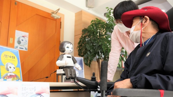 특히, 이번 체험에서는 동요, 동화 등 교육기능뿐만 아니라 AI기능을 통해 이용자와 대화를 이어가기도 했습니다. "노래 한번 불러줘" "좋아하는 음식이 뭐니?" "내일 날씨 알려줘" 이용자의 질문에 때론 엉뚱한 답변하고 말을 듣지 않을 때도 있었지만 이마저 복지관 로비에 있던 모든 사람에게 웃음을 주는 유쾌한 시간을 만들어주었습니다.