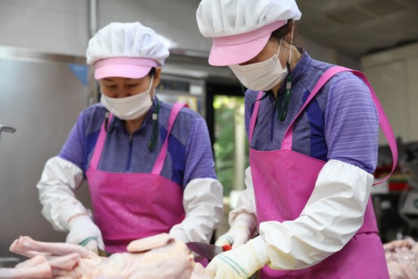 이른 아침부터 복지관 식당은 삼계탕 나눔행사 준비로 분주했습니다. 유난히 무더운 날씨임에도 불구하고 송진숙 조리사를 비롯한 3명의 조리사는 뜨거운 불 앞에서 정성을 담아 삼계탕을 준비했습니다.