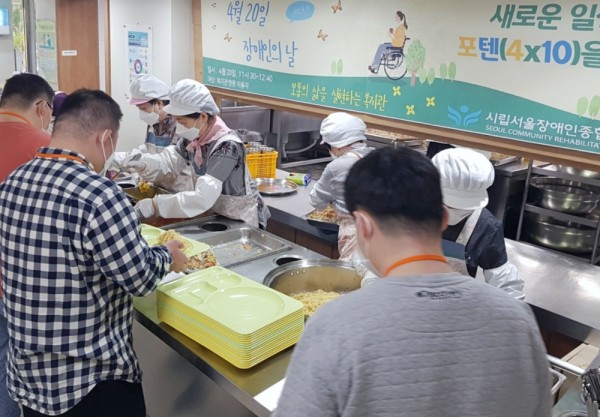 장애인의 날 특식 및 뽑기 이벤트 진행했습니다! 페이지 정보 작성자 서울장애인복지관 작성일22-04-21 18:18 조회수1,087 본문 자세히 보기 장애인의 날을 맞아 복지관 식당에서 특식을 제공하고, 뽑기 이벤트를 진행하여 즐거움을 더했습니다.특별히 셰프를 초청하여 만든 캘리포니아롤, 식당 자원봉사자들이 정성스럽게 만든 또띠아 스파게티, 단호박 샐러드 등 평소 이용자들이 자주 접하기 어려운 메뉴로 식단을 구성하여 식당 이용의 즐거움을 높였습니다.또한, 소소한 선물을 준비하여 뽑기 이벤트를 통해 이용자들과 즐겁게 소통하는 시간을 갖고 감사의 마음도 전했습니다. 자세히 보기 자세히 보기 목록 답변 이전글 장애인 건강보건관리 우수 수행기관으로 ‘보건복지부장관 표창’ 수상 22.04.25 다음글 장애 당사자의 이웃으로, 친구로 함께할 시민옹호활동가의 동행길을 응원합니다. 22.04.21
