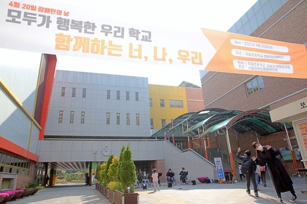 사진 : 서울강솔초등학교 정문. 장애인의 날을 알리는 현수막 아래 학교 선생님들과 복지관 직원들이 등굣길을 맞이하는 모습