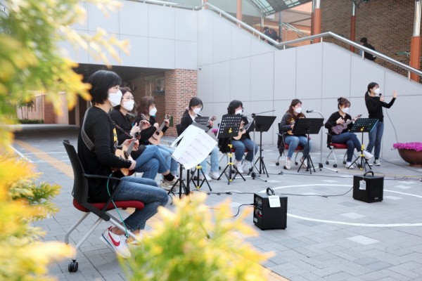 사진 : 학교 정문을 들어서자마자 보이는 열린 야외 공간에서 마을기획단 주민들이 우쿨렐레 연주로 등굣길을 맞이하고 있다.