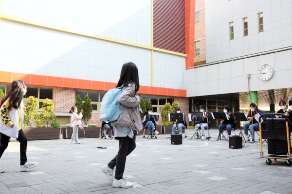 등굣길 아침 엄마들의 우쿨렐레 연주를 보면서 수줍게 지나치는 아이, ‘무슨 날이지?’ 어리둥절한 아이, 예쁜 소리에 귀 기울이는 아이,