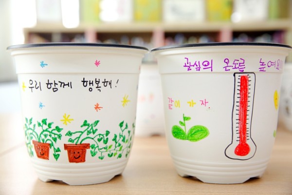 (왼쪽)지역포괄촉진부가 제작하여 학생들에게 나눠준 장애인의 날 안내문 (오른쪽) 학생들이 참여하는 '화분 꾸미기 활동' 전 미리 제작해 본 화분