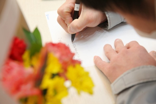 (사진 왼쪽 : 지역사회 공헌 활동 의미를 알기 위한 자원활동 교육 진행 중 / 오른쪽 : 꽃바구니를 받는 사람을 생각하며 메시지 카드 적는 중)