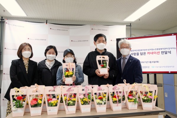 (사진 왼쪽 : 성인 발달장애인들이 하루 동안 만든 카네이션 꽃바구니들 / 오른쪽 : 직접 만든 카네이션 꽃바구니를 성가정노인종합복지관에 전달하는 모습)