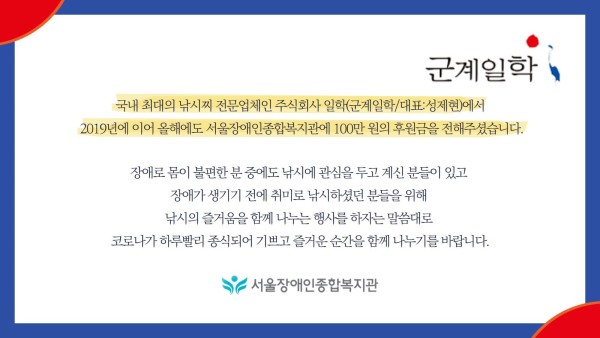 국내 최대의 낚시찌 전문업체인 주식회사 일학(군계일학/대표:성제현)에서 2019년에 이어 올해에도 복지관에 100만 원의 후원금을 전해주셨습니다.