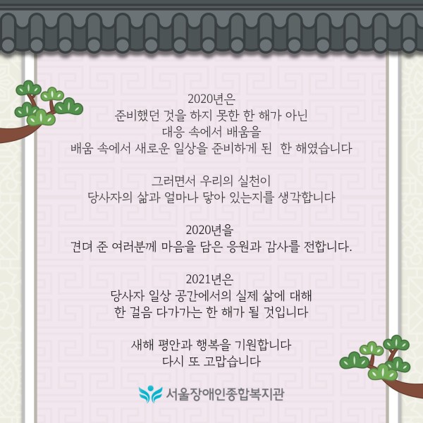2020년 끝자락 인사를 드립니다 페이지 정보 작성자 서울장애인복지관 작성일20-12-31 17:43 조회수1,133 본문 자세히 보기2020년 끝자락 인사를 드립니다. 자세히 보기2020년은준비했던 것을 하지 못한 한 해가 아닌대응 속에서 배움을배움 속에서 새로운 일상을 준비하게 된 한 해였습니다 그러면서 우리의 실천이당사자의 삶과 얼마나 닿아 있는지를 생각합니다 2020년을 견뎌 준 여러분께 마음을 담은 응원과 감사를 전합니다. 2021년은 당사자 일상 공간에서의 실제 삶에 대해한 걸음 다가가는 한 해가 될 것입니다 새해 평안과 행복을 기원합니다다시 또 고맙습니다 목록 답변 이전글 [온라인 시무식 상영 영상 소개 ]AI 인공지능 아나운서가 전하는 서울장애인종합복지관 2021 사업 간추린 안내 21.01.04 다음글 온라인 사업브리핑, 온라인 종무식이 열린 서울장애인종합복지관 20.12.31
