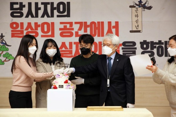 (사진_신입직원 인사와 새해 기념 케이크 커팅)