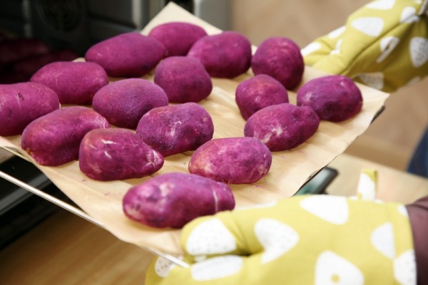 고구마빵은 밀가루가 아닌 타피오카 펄을 반죽하여 쫀득쫀득하고 좋은 식감을 자랑하며, 여기에 자색고구마 분말을 사용해 고구마빵의 색감이 살아났습니다.